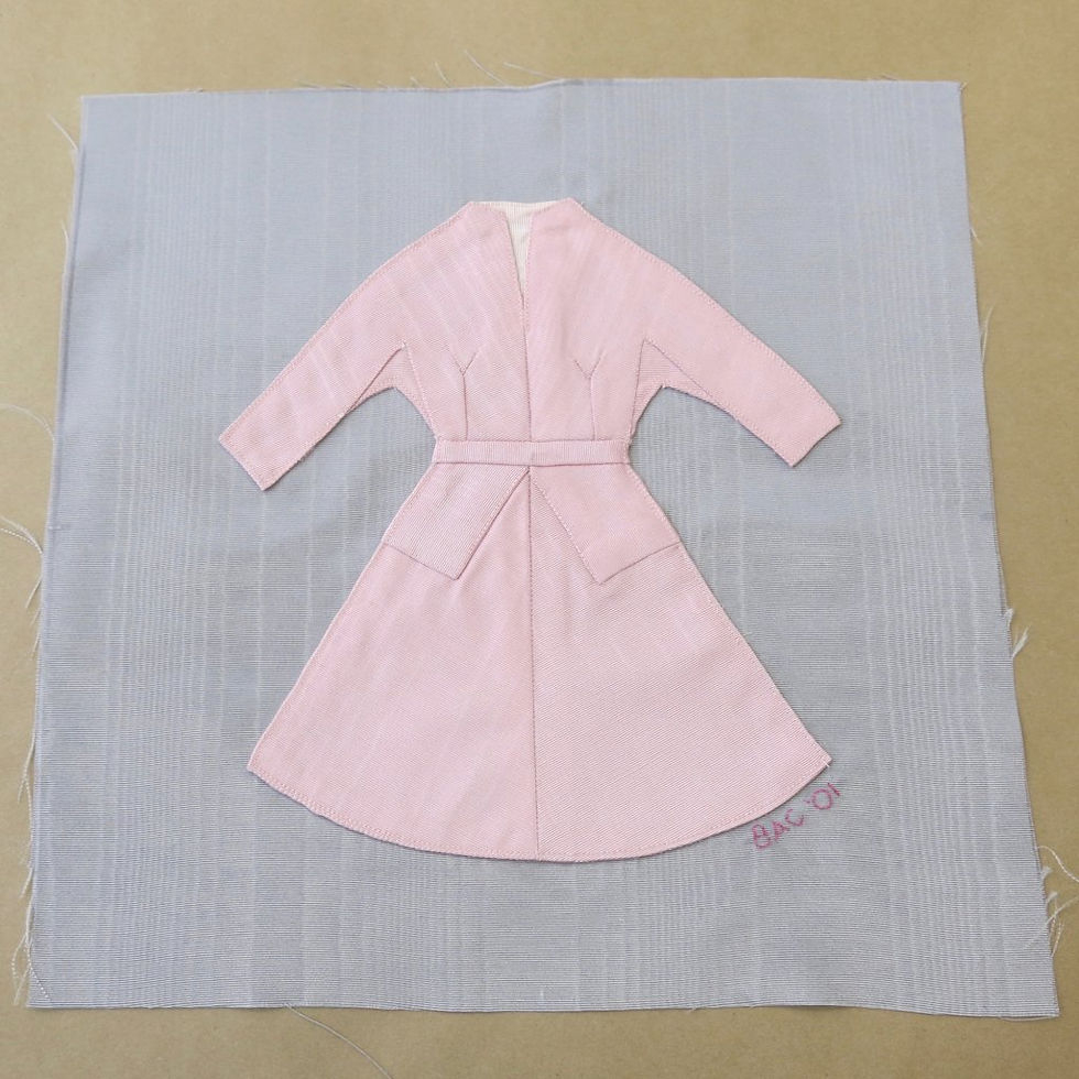 It is great that in researching this dress it has tons of pictures to choose from. It was obvious the fabric is a light gray moire which is very fun for me to work with. However, I had trouble finding gray moire at first but finally found some on Mood. I'm just working on which will have the strength for the construction of this dress. I was able to find several images of in process of this design. There was a draping picture and I also found a picture from a designer who had made the dress for school. She was working on a quilt square and he project showed the ideal configuration for the pattern for this dress.